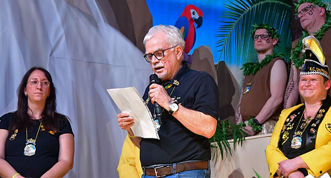 Traditionell im Rahmen der 3. Prunksitzung im Bürgerhaus Maikammer wurde der Verdienstorden des KC Maikammer „Die Päädel-Dancers“ verliehen – die höchste Auszeichnung des Vereins. In diesem Jahr ging die Ehrung an Bernd Schuster. Die Laudatio hielt der letztjährige Ordensträger Werner Zangmeister, der mit persönlichen, treffenden und zugleich humorvollen Worten die Verdienste seines Nachfolgers würdigte.
